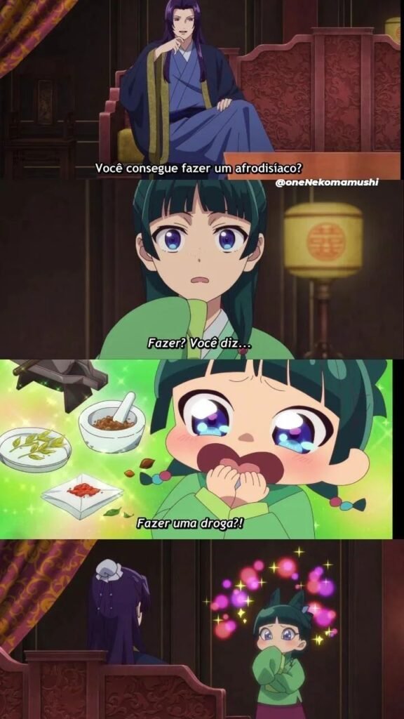 - Maomao desvendando envenenamentos e salvando vidas usando técnicas de boticário.
