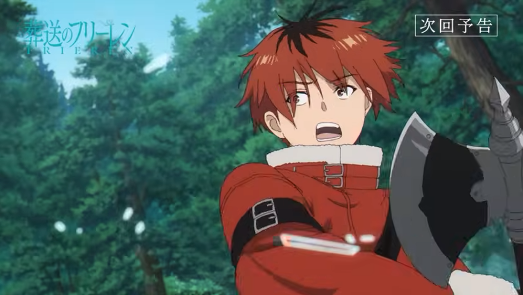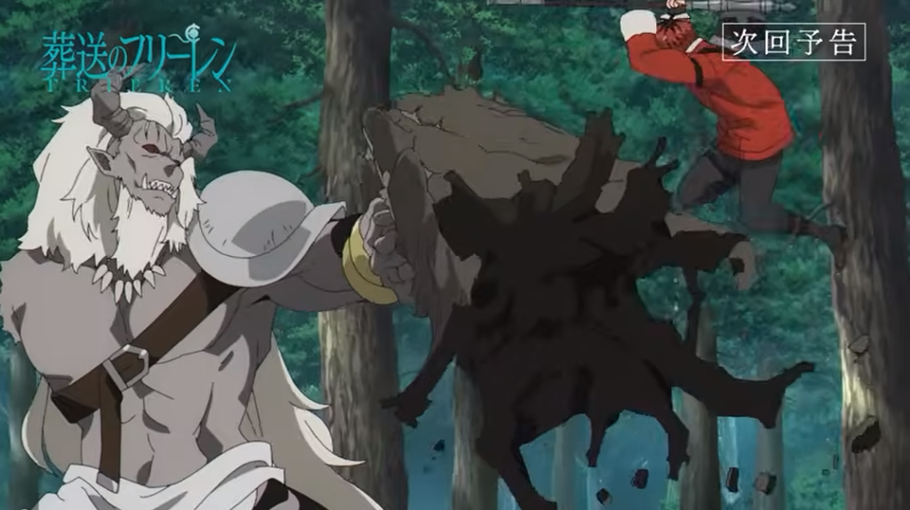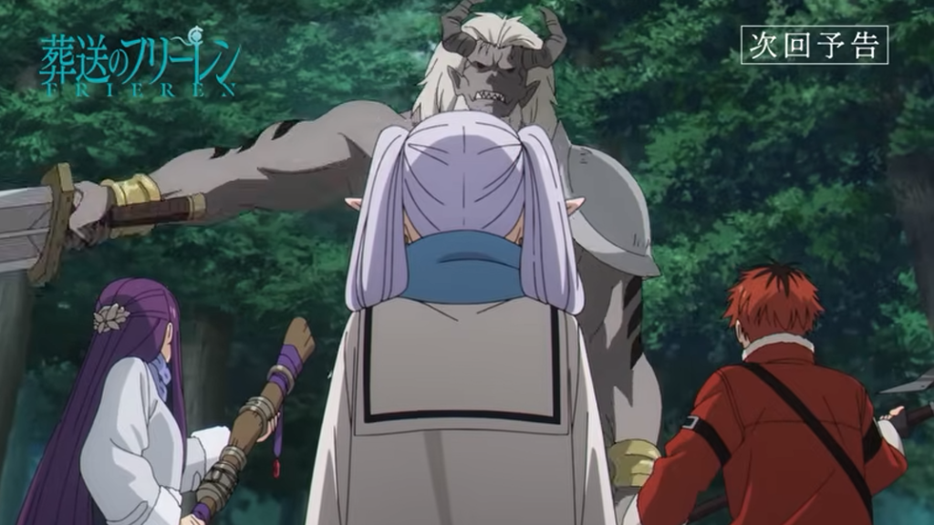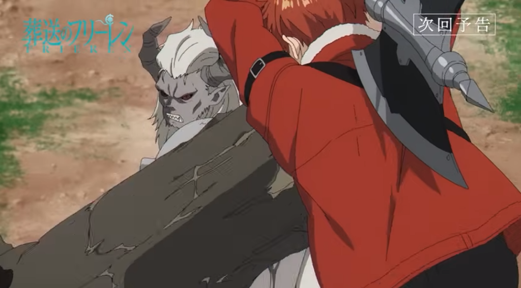 Após essa pausa emocional na cidade, o episódio muda de tom rapidamente. Frieren, Fern e Stark retomam sua viagem em direção ao rigoroso planalto do norte . No caminho, param em um vilarejo e lá escutam rumores perturbadores: um poderoso monstro tem aparecido nas redondezas .